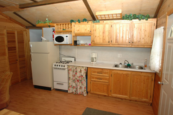 - complete kitchen with fridge, stove, microwave, pots, pans, utensils, coffee pot