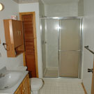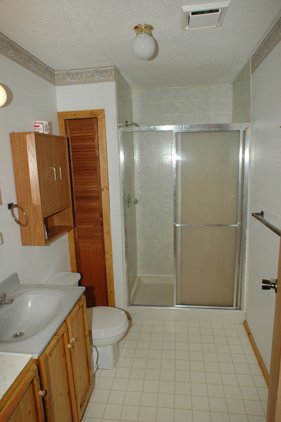 - full bathroom with shower, toilet and sink, all towels
